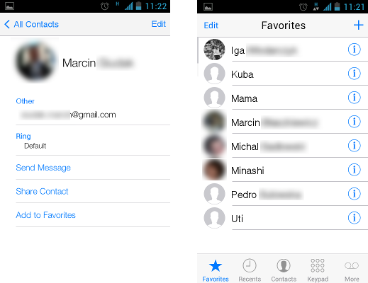Был также список избранных контактов, где каждый элемент отображается вместе с миниатюрой фотографии. Стоит отметить, что Espier Dialer iOS7 может изменять экраны входящих и исходящих вызовов, что не является общей функцией. Единственным недостатком этого решения является то, что приложение использует обои основного экрана в качестве фона, так что иногда некоторые из доступных кнопок едва заметны. Однако мы можем отключить эти функции в настройках.